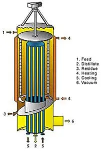 Molecular and wiped film distillation employ the basic principles of thin film distillation. Thin film distillation involves the heating of a raw material on a heated tube’s internal surface until the boiling component begins to evaporate. The vapors are then condensed on the low-temperature tubes of a condenser. A basic wiped film distillation evaporator adds an agitated thin film to create a bow wave that increase heat transfer and evaporation efficiency.